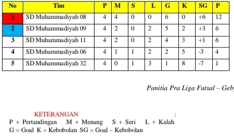 Pada ajang Pra Liga Futsal Pada kategori Usia 12 Tahun, SD Muhammadiyah 04 tampil dominan dan konsisten hingga akhirnya dinobatkan sebagai Juara Pra Liga Futsal U-12 dengan point penuh tanpa serih dan kalah.